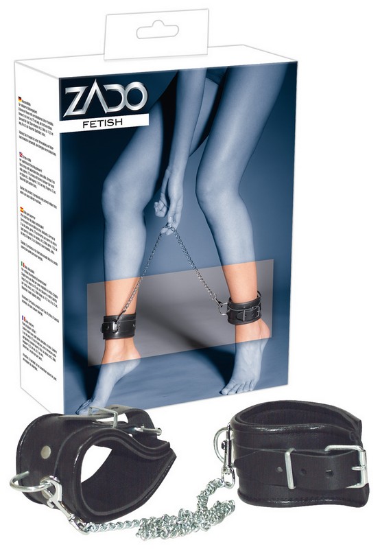 Schränken die Bewegungsfreiheit erregend ein! Ca. 6 cm breite, verstellbare Fußgelenk-Manschetten aus schwarzem Echt-Leder, innen weich gepolstert. Die stählerne, schrittlange Kette zwischen den Fesseln begrenzt die Bewegungen und lässt sich nach erfolgter Bestrafung leicht aushaken (Karabinerhaken).